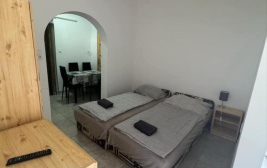 🟦 Apartament 1 (5+1 os.): 2 sypialnie – 1 łóżko pojedyncze + 1 duże podwójne (180×200 cm) / 2 łóżka pojedyncze